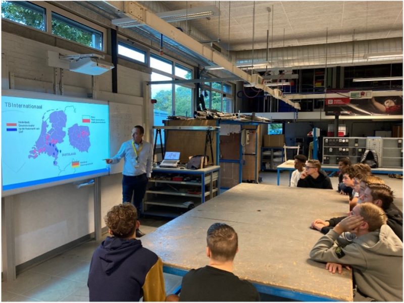 In de praktijkruimte vertelde Hoefman aan een andere groep leerlingen meer over het bedrijf. TB is al meer dan zeventig jaar dealer van DAF en groeit nog steeds. Met zestien filialen in Nederland, één in Duitsland en zes in Polen hebben ze maar liefst duizend medewerkers in dienst. Net als voor veel bedrijven is het ook voor TB van belang om jonge mensen zo vroeg mogelijk enthousiast te maken voor motorvoertuigentechniek en dan speciaal gericht op vrachtwagens. Hij liet de leerlingen diverse filmpjes van zijn bedrijf zien. Tijdens deze presentatie had Hoefman ook nog een quiz in petto. De winnaar van de quiz kreeg een schaalmodel van de truck die ze hadden meegenomen.